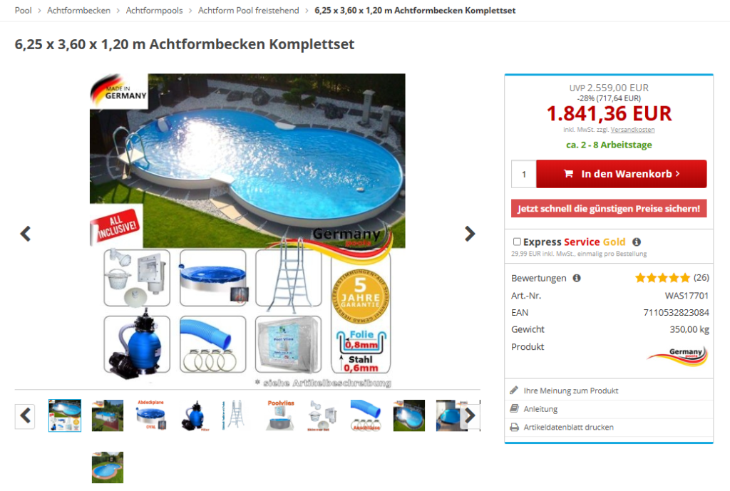 Ein Achtformbecken wird häufig als Komplettset angeboten. Das bedeutet, dass alle notwendigen Komponenten bereits enthalten sind. Dazu zählen unter anderem: