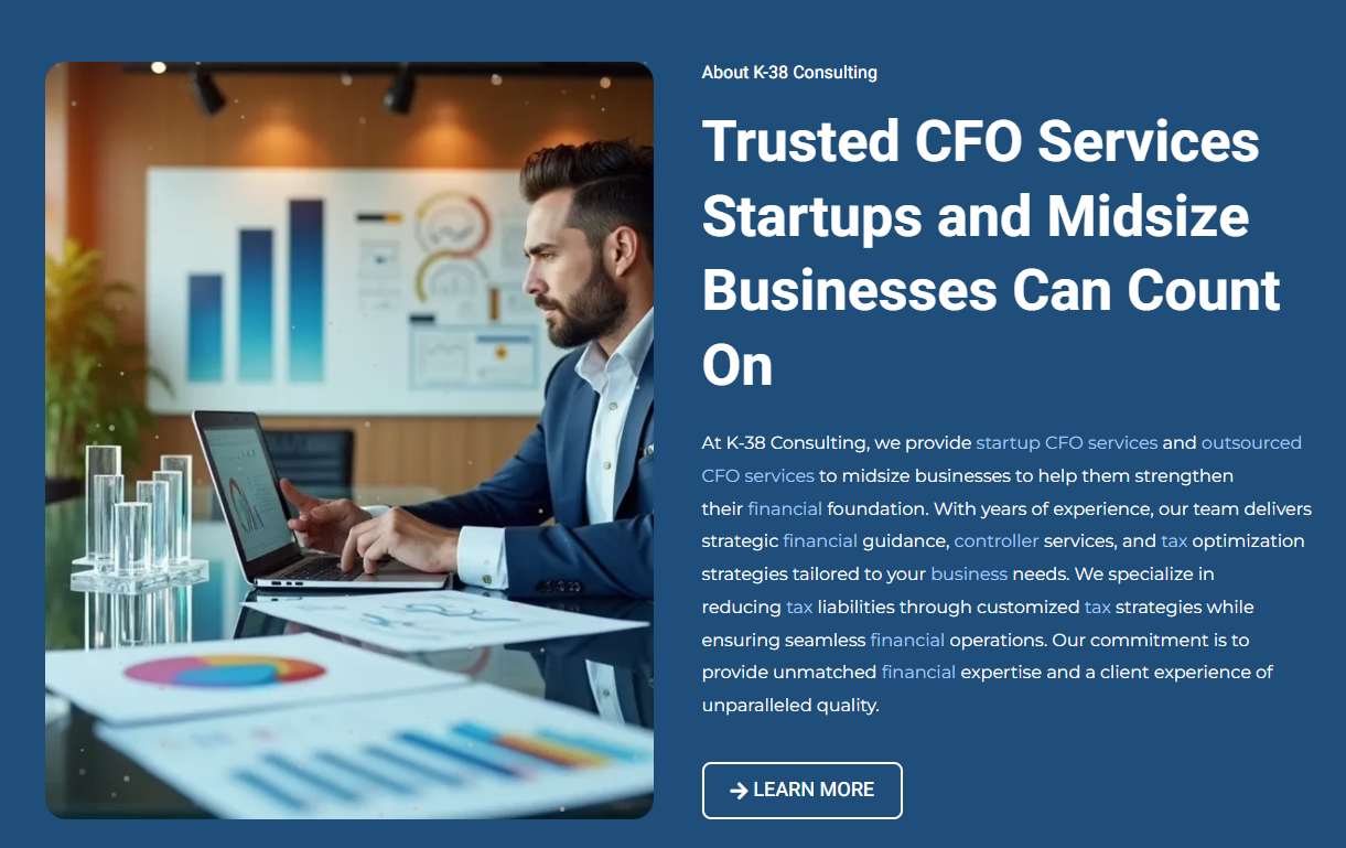 K-38 Consulting, LLC specializes in providing tailored financial leadership to startups, helping them navigate complex financial landscapes and achieve sustainable growth. With services ranging from cash flow management to R&D tax credit optimization, K-38 empowers businesses to make informed decisions, minimize risks, and scale efficiently.